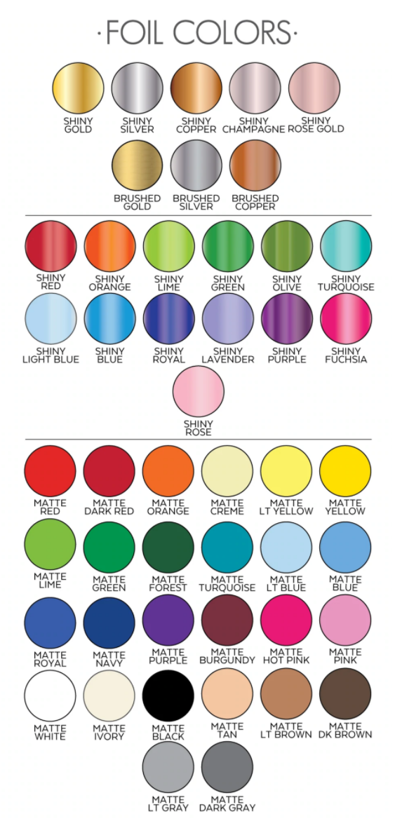• Foil Hot Stamping or Ink Imprinted (choose from over 100 colors)
