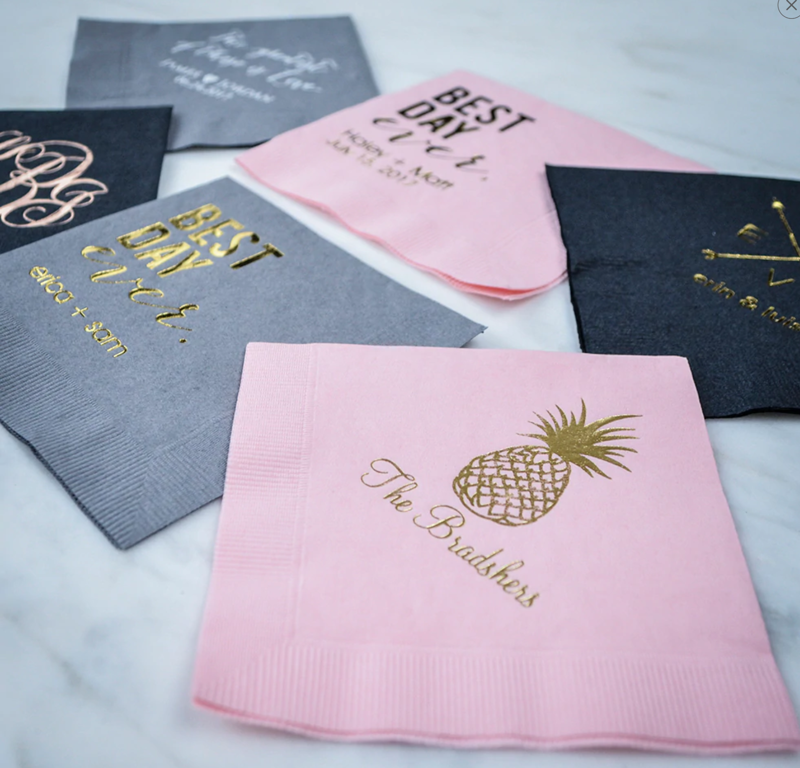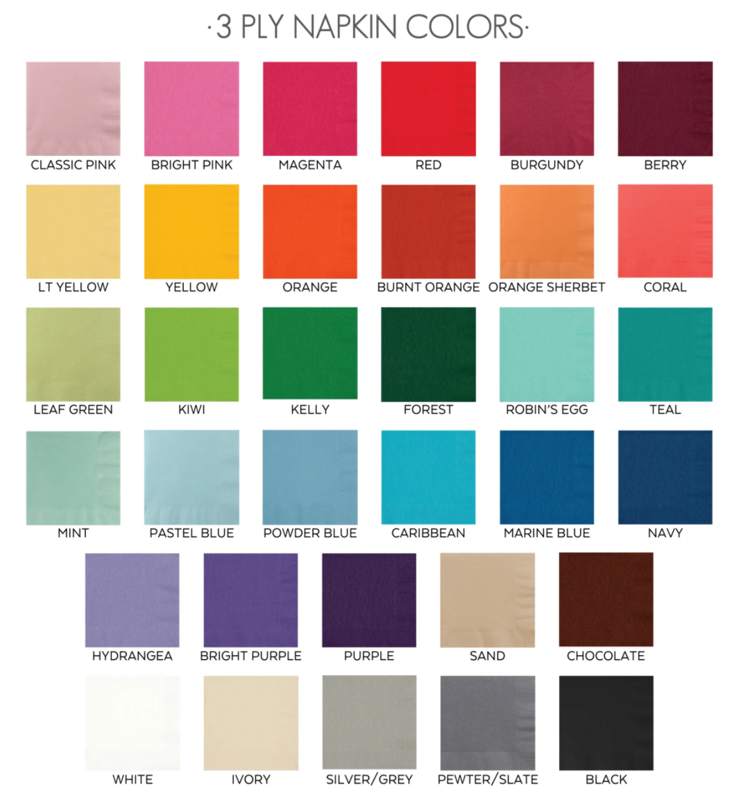 Personalized 3-Ply napkins and guest towels are perfect for any occasion. These napkins are the better party store type napkins constructed from soft 3-ply premium material with a coin embossed edge. These come in a wide variety of colors and ink colors may be matched to napkin color to use on cups, coasters, stir sticks or any of our imprintable items.