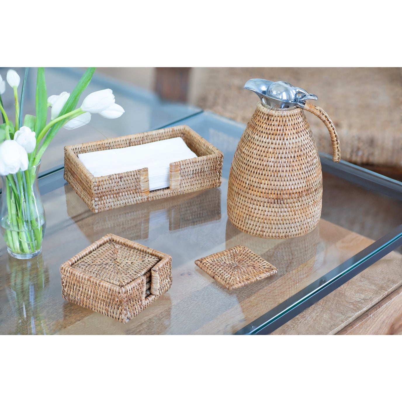 Designed for luncheon napkins, cocktail napkins, or guest towels our rattan napkin holder provides stylish storage space for your kitchen table, office desk, buffet, bar, and bathroom countertop.