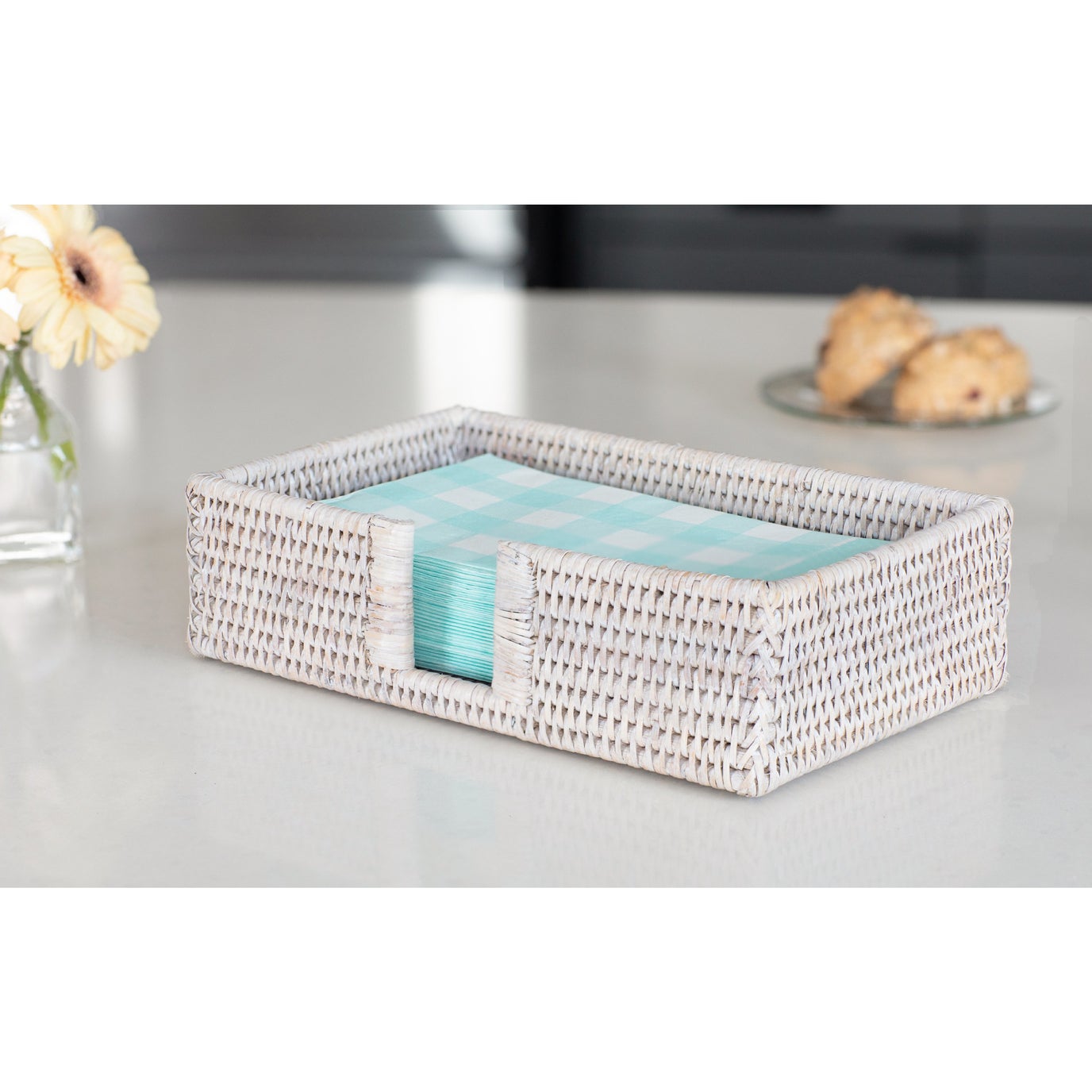 Designed for luncheon napkins, cocktail napkins, or guest towels our rattan napkin holder provides stylish storage space for your kitchen table, office desk, buffet, bar, and bathroom countertop.